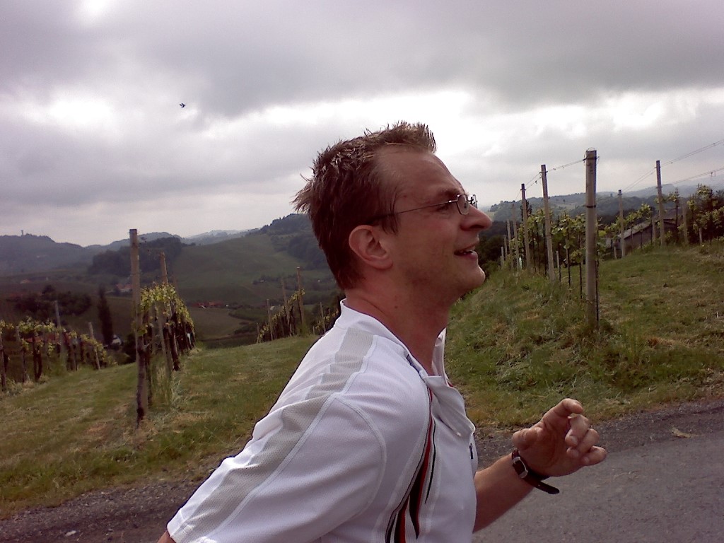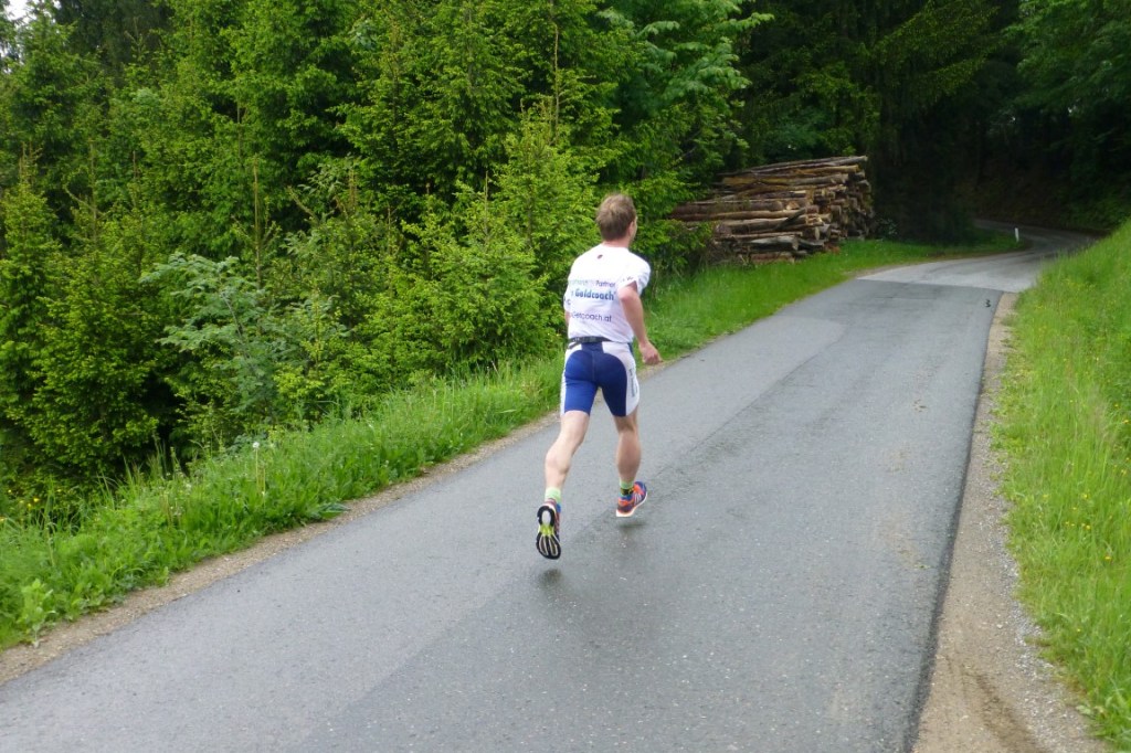 Bei km 33 wurde ich dann von Walter Krenn überholt: ein routinierter Ultra-Bergläufer mit vielen Siegen auf seinem Konto, der nicht unbedingt zu den spritzigsten Läufern gehört, aber sein Tempo dafür nahezu ewig halten kann. Ich machte also keine Versuche ihn zurück zu attackieren (abgesehen davon, wäre es vom Tempo auch nicht möglich gewesen – das macht solche Entscheidungen unheimlich leicht…). Ich lag jetzt auf Rang drei und war nach hinten sehr gut abgesichert: bei Blicken zurück war über rund einen km kein weiterer Läufer zu sehen. So bin ich den letzten Anstieg wirklich sehr verhalten gelaufen, um die letzten sieben km abwärts Richtung Ehrenhausen doch noch etwas Druck machen zu können bzw. mich nicht auf einen Schlusssprint einlassen zu müssen.