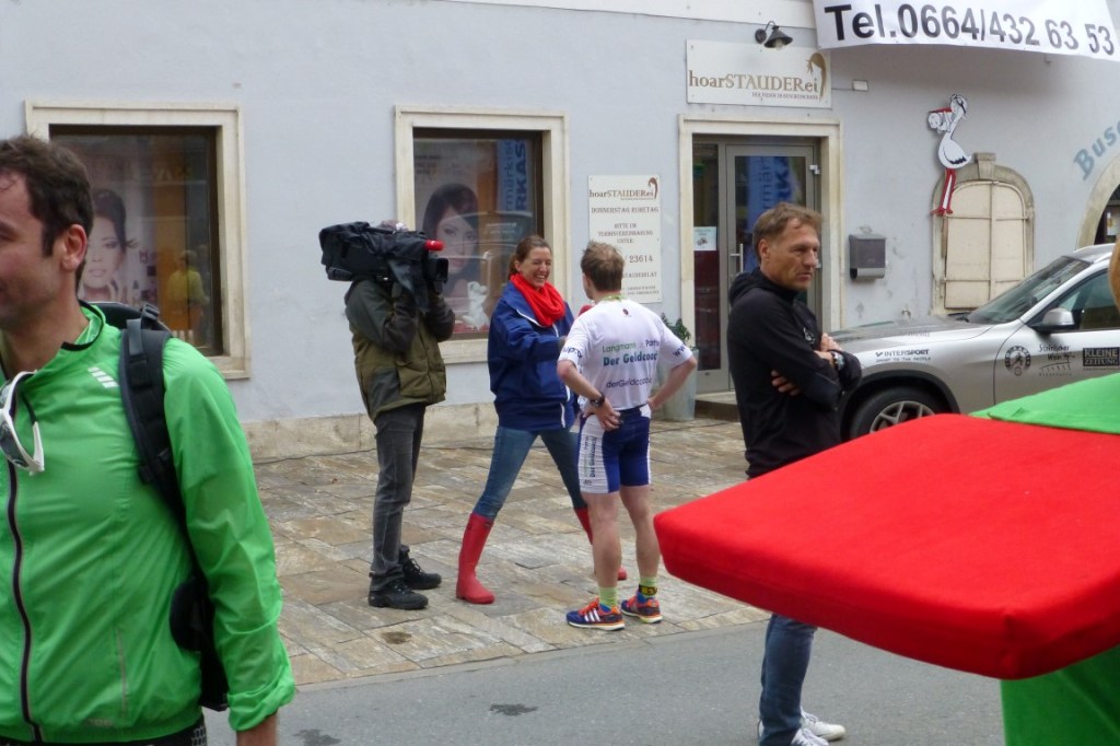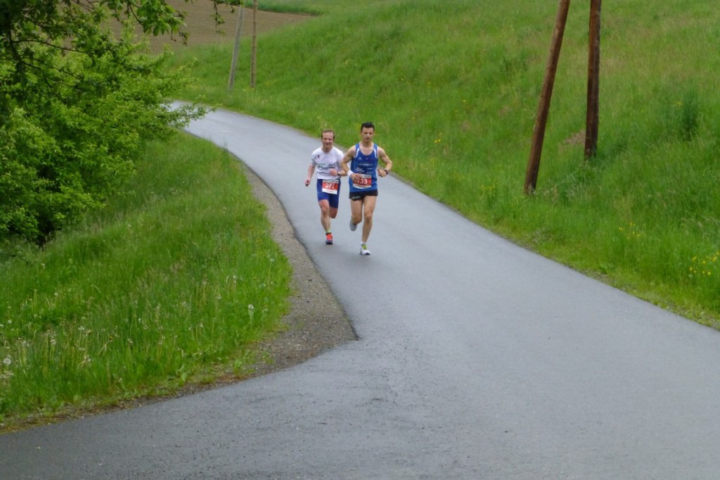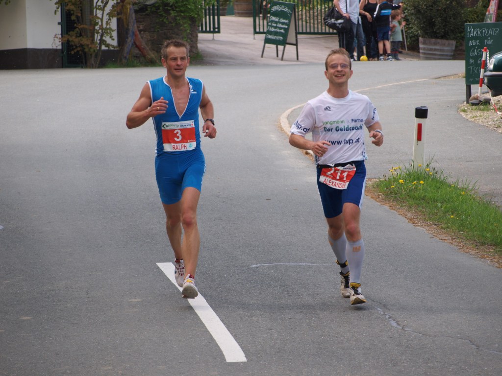 Gleich nach dem Start löste ich mich gemeinsam mit Hermann Peindl und Siegfried Knar vom Rest des Feldes. Siegfried Knar mußte beim zu Beginn recht hohen Tempo (4:13/km auf die ersten fünf km) etwas rausnehmen und war dann bei km 7 schon deutlich hinter uns. So bildeten Peindl und ich das Führungs-Duo – da war auch mir klar, daß es heute durchaus für einen Platz am Stockerl reichen kann. Aber ein Marathon entscheidet sich (in diesem Fall leider) nicht nach den ersten sieben, sondern eben letzten paar Kilometern… Mein erklärtes Ziel war nun, ein Platz am Stockerl und mein Plan dafür war, möglichst lange mit Hermann Peindl im Gleichschritt zu laufen und wenn es für mich zu hart werden würde (Peindl ist einfach eine Klasse besser als) mit guten Beinen und Reserven nach hinten hin einen Platz am Stockerl zu verteidigen.